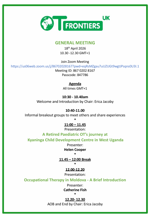 This meeting is open to all, including occupational therapists, students, and anyone interested in global perspectives and partnership working in occupational therapy.